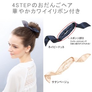 ピンも使わずクルクル巻くだけでキュートなおだんごヘアが作れると大好評の「おだんごヘアメイカー」に、華やかで可愛いリボン付きタイプが登場です。1.おだんごを作りたい位置で髪をゴムで束ね、本品のスリット部分に毛先を通して挟む→2.本品に髪を巻きつけながら、外巻きに結び目の上まで巻き上げる→3.スポンジ部分を曲げ、結び目を中心に輪になるように形を作り、リボンを下でクロスさせる→4.リボンを上へ持ち上げて固定し、髪を広げて好みの形を作る―という簡単4ステップで、長時間崩れにくいおだんごヘアが完成。リボンはワイヤー入りなので、自由に動きをつけて好きな形に整えることができます。カジュアルな雰囲気の<ネイビードット>と、エレガントな服にも似合う<サテンベージュ>の2色。 …