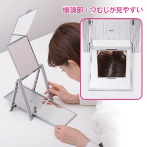 3枚のミラーがジョイントされており、広げて下のミラーをのぞけば、見づらい頭頂部、つむじなどがチェックできて、キレイな仕上がりに。また卓上ミラーとして普段のメイクにも活躍。また3面鏡のように横に広げて使えば、左右の襟足まではっきり見えます。折りたためばコンパクトになるので収納や持ち運びに便利。また鏡には色の変化が少なく、本当の肌色が映るナピュアミラーを採用。ファンデーションを合わせたりポイントメイクをするのにぴったりです。