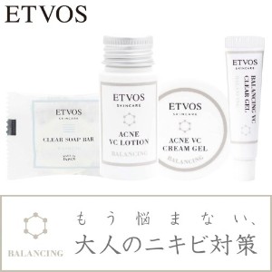 【ナチュラルコスメ】ヒト型セラミド+植物のチカラで肌の若々しさを引き出してキープする、ナチュラルサイエンスなスキンケアライン「エトヴォス セラミドスキンケア」より。毛穴が気になる方や肌トラブルを予防したい方におすすめの「バランシングライン」のトライアルキットです。保湿成分がギュッと濃縮された「クリアソープバー」と、あご周りやおでこなどの部分用整肌美容液「バランシングVCクリアジェル」肌をすこやかに整えながらハリ・ツヤを与える「薬用アクネVCローション」、角質層へじっくり浸透する油溶性ビタミンC誘導体配合でゆらぎがちな肌のうるおいをまもる「薬用アクネVCクリームジェル」、4アイテムが約2週間お試しできるセットに。肌をすこやかに整える植物の葉エキスも配合されたライン使いで、トラブルのないツルスベ肌を目指せます。