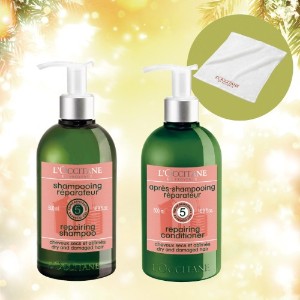 南仏・プロヴァンスの恵みを届ける「ロクシタン」から。ロクシタンのヘアケア「ファイブハーブス」シリーズの中でも特に人気の高い「リペアリング」シリーズから、たっぷり500mLボトルのシャンプー&コンディショナーのコンビを、お得なキット価格でお届け。さらにプレゼントとしてゲストタオルが付いてきます♪ダメージヘアのための5つのエッセンシャルオイル(※1)や、髪を補修してしなやかにする「リペアリングコンプレックス」(※2)を配合。植物由来の洗浄成分でやさしく洗いながら、ダメージや乾燥でパサつきがちな髪を、芯からすこやかなサラツヤ髪に導きます。爽やかなアロマティックハーブの香り※1 アンゼリカ根油、アンゼリカ種子油、ゼラニウム油、オレンジ油、イランイラン花油、ラベンダー油(全てヘアコンディショニング成分)※2 ブラックオーツエキス(アベナストリゴサ種子エキス)、ソイプロテクト(レシチン) すべてヘアコンディショニング成分