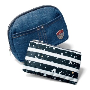 毎日の使いやすさを工夫した、機能派揃いのバッグ&ポーチ。大人っぽいストライプ柄とデニム調の生地に、さりげなくあしらったミッキーモチーフの落ち着いたデザインも魅力です。